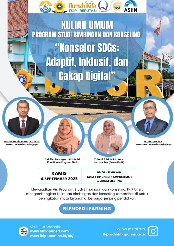 Pada hari Kamis, 4 September 2025, bertempat di Fakultas Keguruan dan Ilmu Pendidikan Universitas Sriwijaya (FKIP) – Kampus KM 5,5 dan melalui Zoom Meeting, Program Studi Bimbingan dan Konseling (BK) menyelenggarakan Kuliah Umum dengan tema: “Konselor SDGs: Adaptif, Inklusif, dan Cakap Digital”.